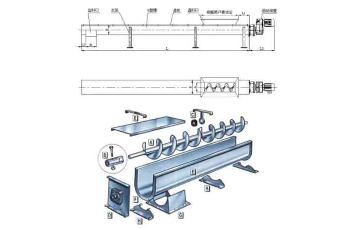 主要由减速机、联轴器、减速机座、螺旋体、悬挂装置、壳体等部分组成(总长度<4m的无悬挂装置)。