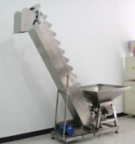 斗式上料机主要由牵引构件(橡胶带或链条)承载构件(料斗)头轮和底轮、驱动装置、张紧装置、机壳等组成。闭合的牵引构件环绕于头轮和底轮上,并被张紧装置张紧。牵引构件的全长上,每个一定距离装置一个料斗。为防止物料的抛撒和灰尘飞扬,这些运动的部件用机壳封闭。工作时,外部的驱动装置通过头轮带动牵引构件和料斗运行。物料从机座的进料口进入机座底部,被运动着的料斗挖起并向上提升。到达机头后,物料再重力和离心力的作用下脱离料斗,从卸料口排出。
